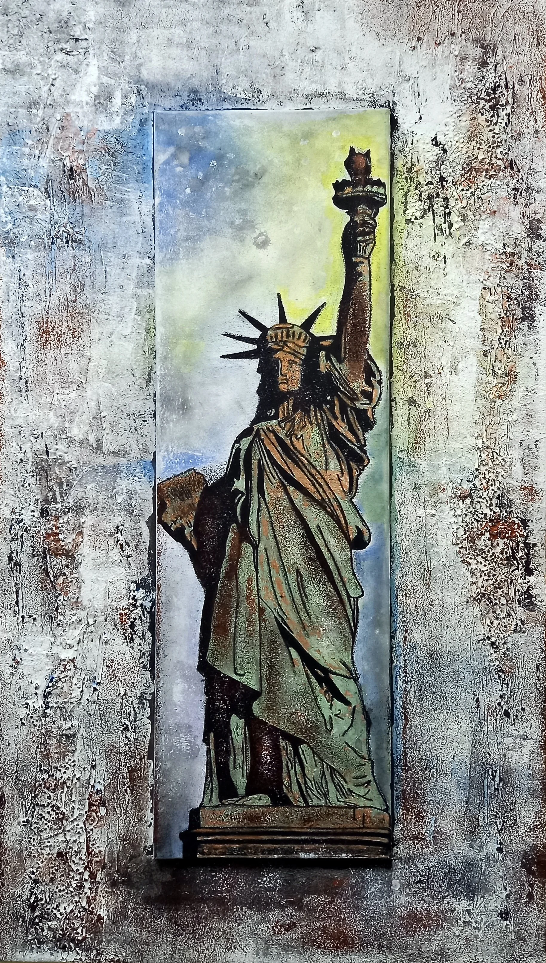 Lady Liberty, kraftvoll und roh. Sie ist mehr als ein Symbol und trägt den Geist von Aufbruch und Eigenmacht direkt in den Raum.